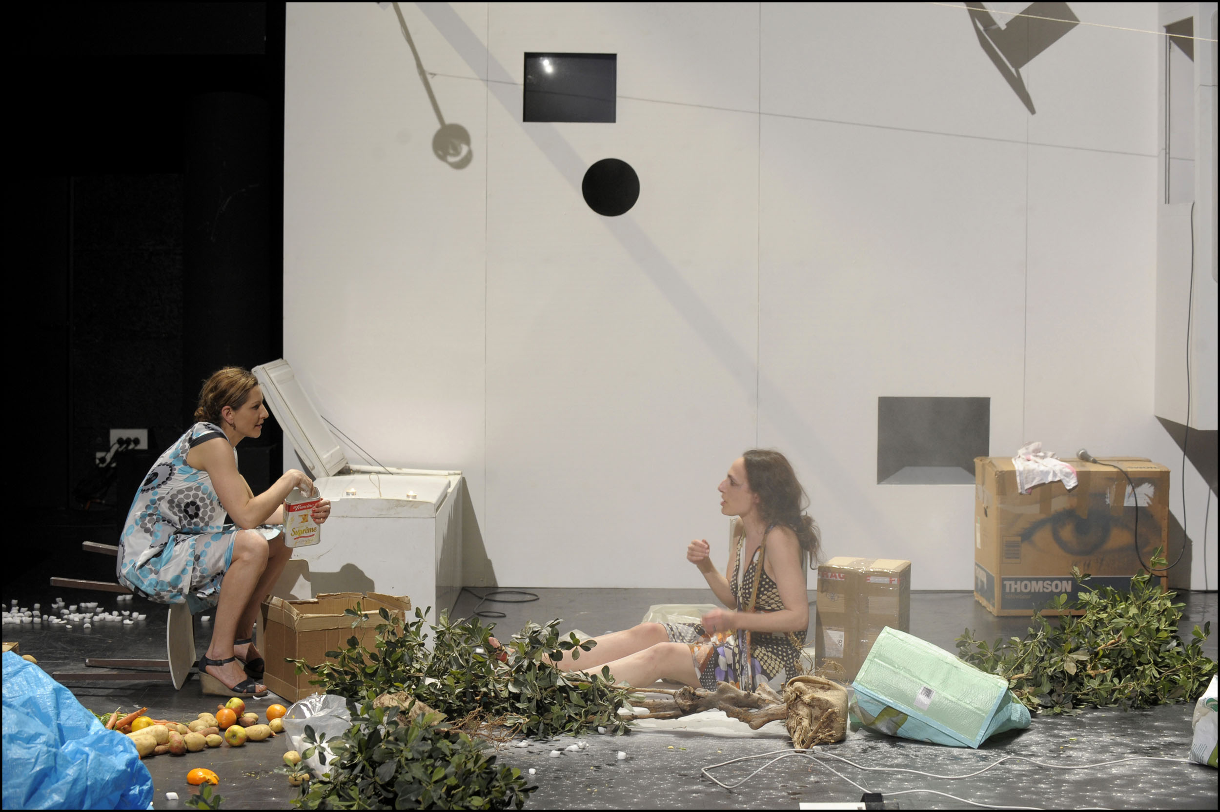 "Deux femmes sur scène, debout, assises, courant, s’arrêtant, en tas, en vrac, en sac, parlent, se parlent, énumèrent, légifèrent, s’interrogent, se demandent, nous demandent, se jugent, se jaugent : mais c’est quoi ? c’est vous, c’est nous, c’est depuis longtemps, c’est ici et maintenant.