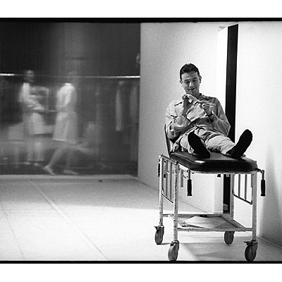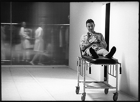 L’espace de jeu est un espace de surexposition, un long couloir, profond, des murs blancs qu iépousent les murs de la salle, un tapis de danse côté blanc au sol, un minimum d’objets, et la possibilité de créer différents lieux : en l’occurence un café, un hôpital, une gare, une maison, un supermarché, et ce que nous avons nommé la "pièce de théâtre inédite" de Peter Handke, regroupant toutes les premières notes du journal, où il transcende la réalité pour mieux la révéler, dans l’esprit de La chevauchée sur le lac de Constance et des autres pièces muettes de l’auteur. Une plaque de plexiglas en fond de scène, au départ de la loge des acteurs avec la costumière, "à vue". Lieu qui se transforme aussi avec les différents espaces et devient chambre à coucher, vestiaires d’un hôpital, fenêtre, véranda...