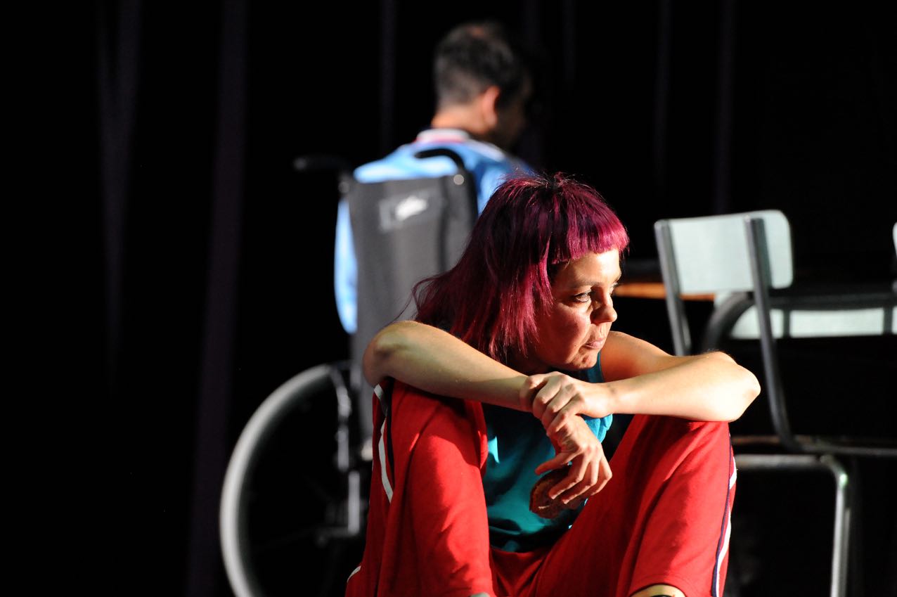 Si j’insiste sur ce regard adolescent, c’est d’abord parce que la pièce de Lee Hall est narrativement « racontée » par Jill, la fille de 14 ans au travers de laquelle on verra tout, on entendra tout. Une des deux importantes « distanciations brechtiennes » de cette pièce (avec la figure d’Elvis, j’y viens…) puisqu’on ne saura pas dans le spectacle si Jill nous raconte sans concession son adolescence avec ses yeux d’adulte, ou si c’est l’adolescente qui écrit frénétiquement et rageusement ses expériences sur un journal intime Sarah Kay…