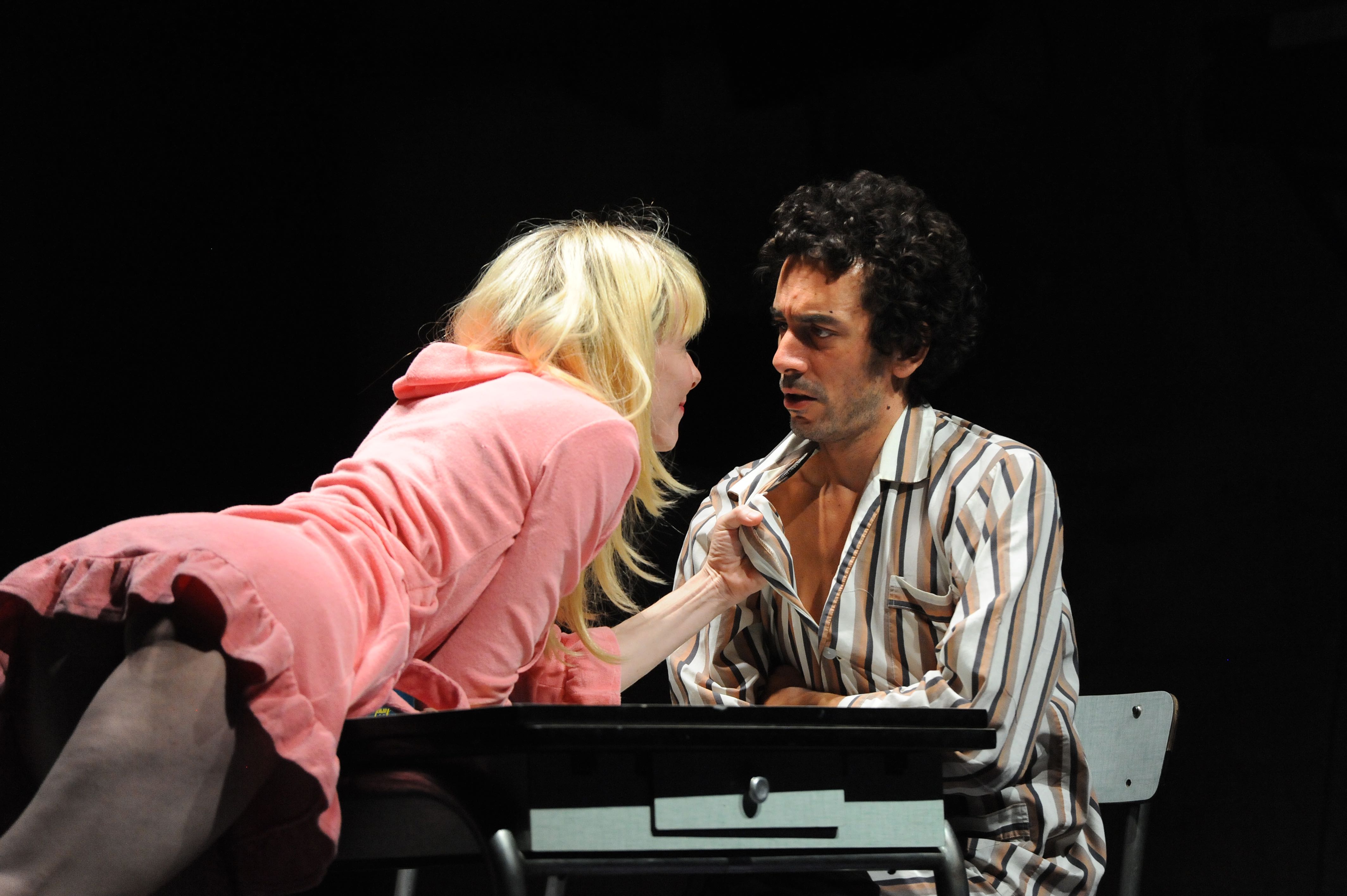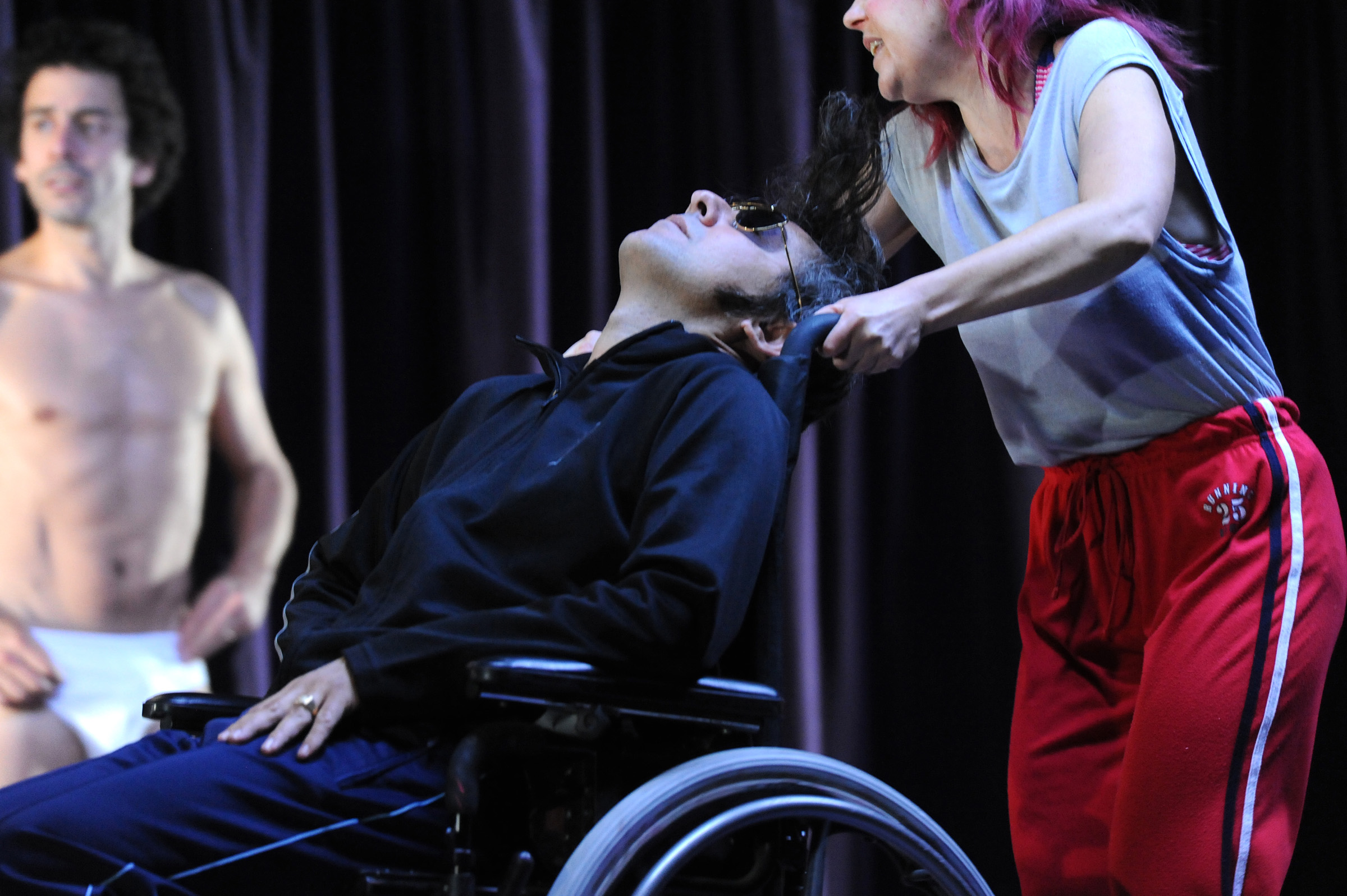 Quant au père paralytique, certainement la figure la plus dérangeante de la pièce, Lee Hall en fait un ancien imitateur transformiste d’Elvis Presley dont les interventions monologiques et musicales scandent le spectacle, faisant voler en éclats la forme réaliste et psychologique dans laquelle il pourrait s’enfermer, pour d’un coup nous transporter dans un « cabaret » fantasmatique dont on ne sait si c’est un sordide club de seconde zone, des réminiscences de Las Vegas, ou la réincarnation du King comme dans le « Mystery train » de Jim Jarmusch.