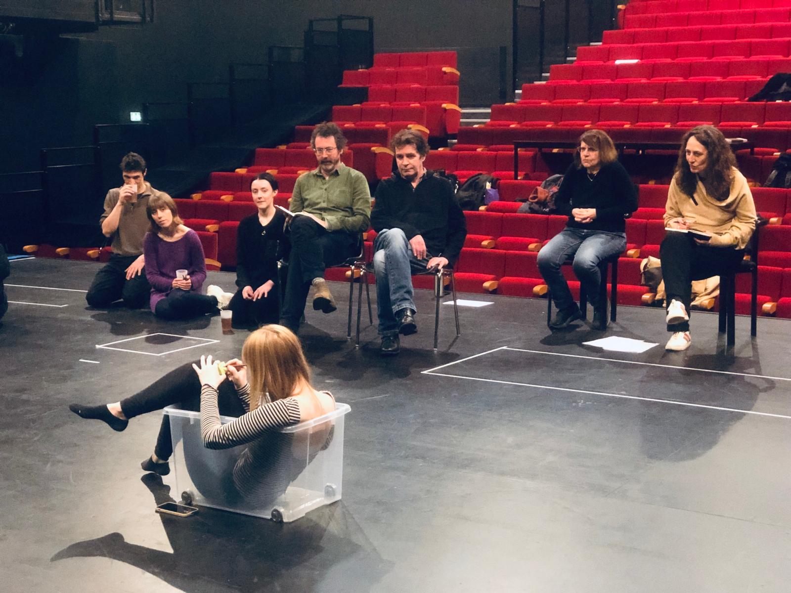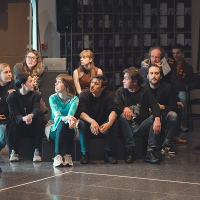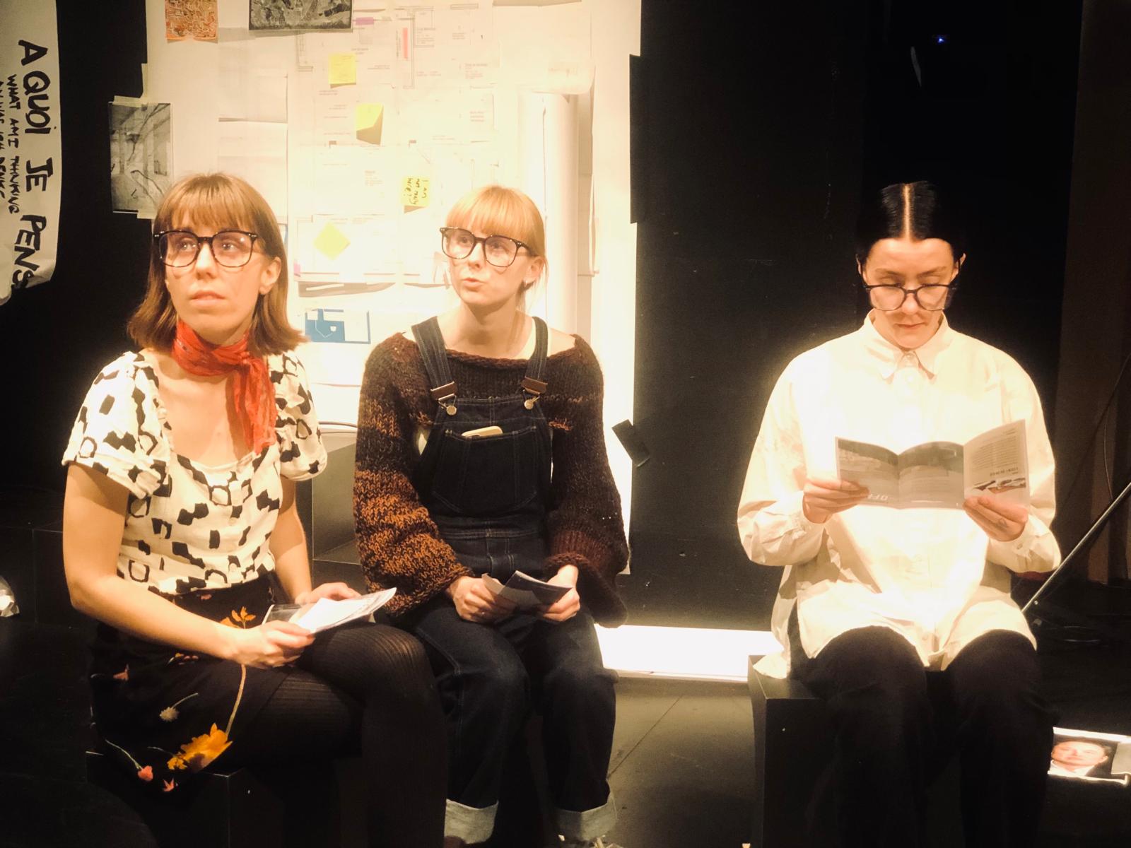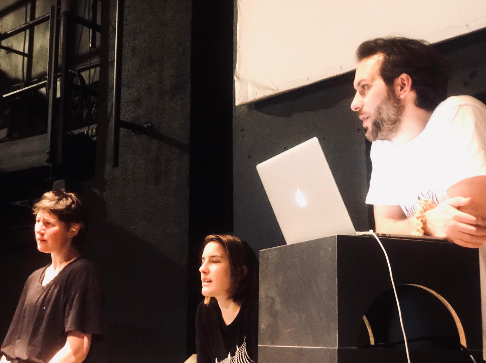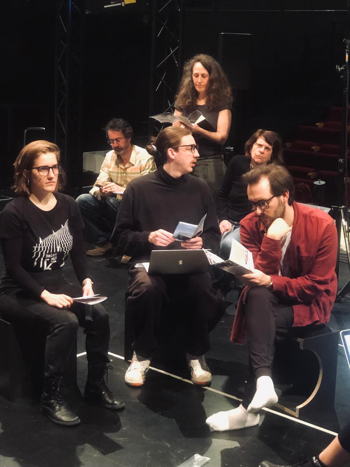 Des présentations publiques ont rendu compte du travail mené dans le cadre des semaines de recherche. Ces présentations comprenaient les esquisses scéniques des étudiant.e.s ainsi que l’évolution/développement de la pièce en cours d’écriture "Voyages avec K."