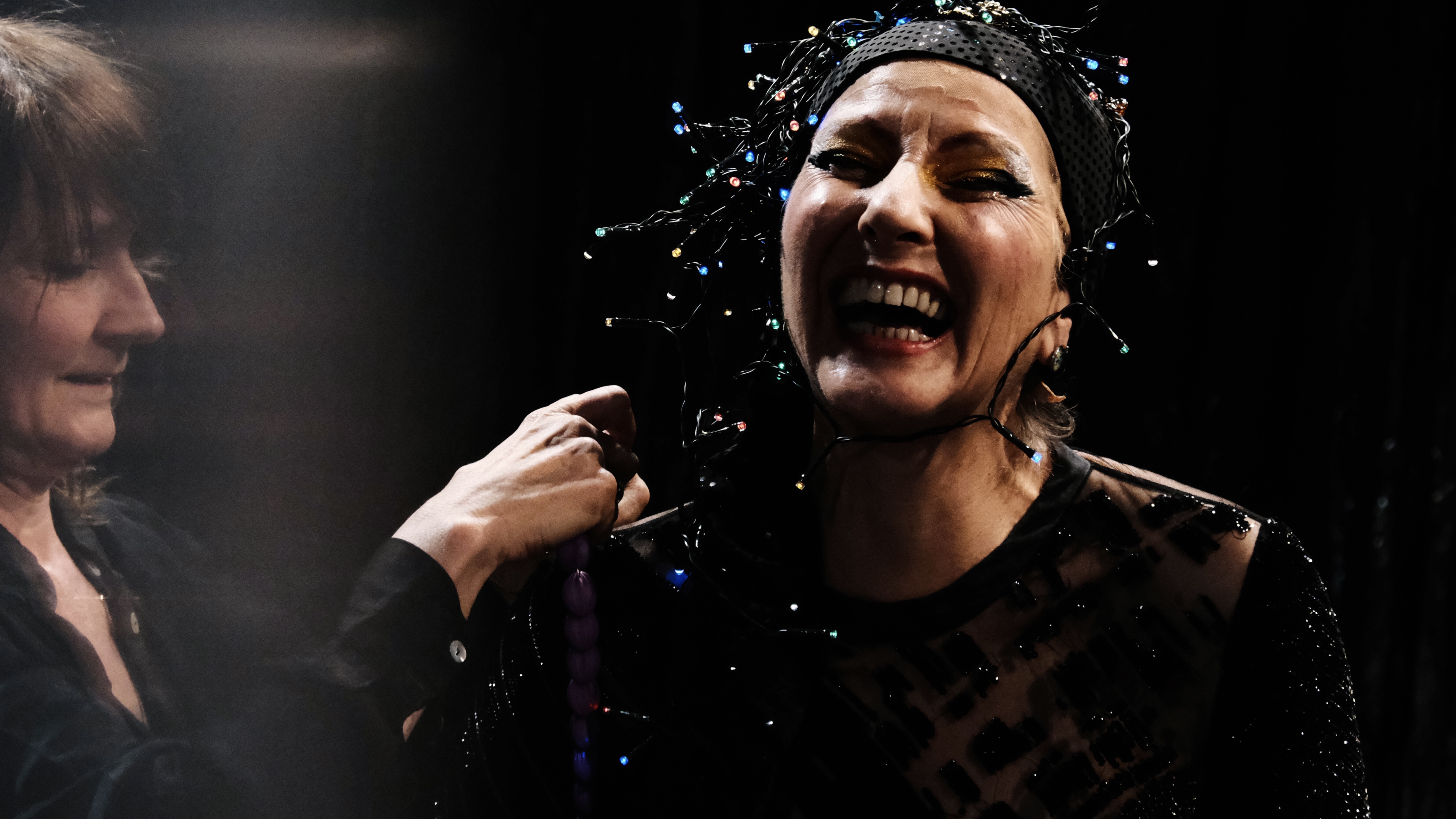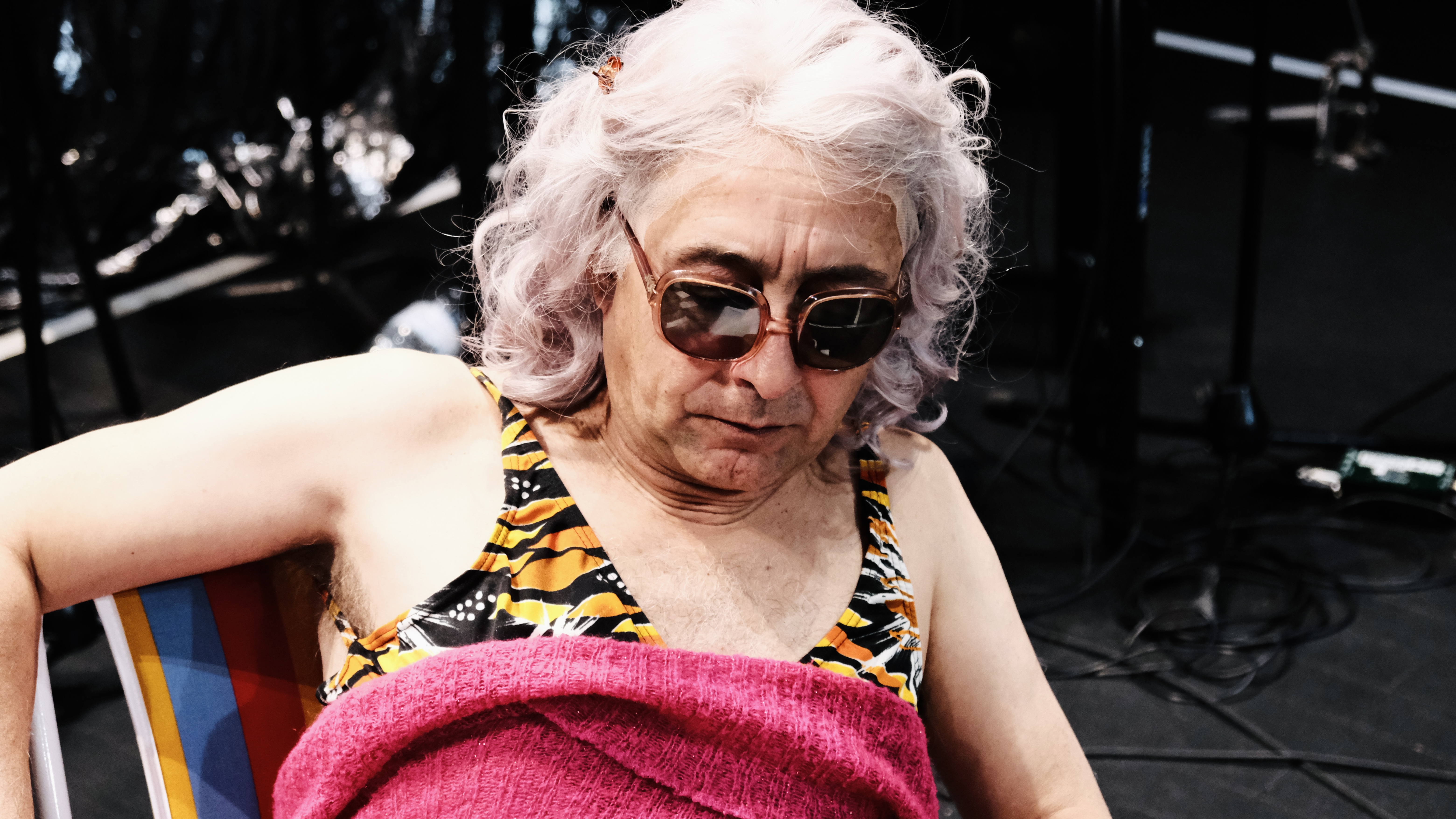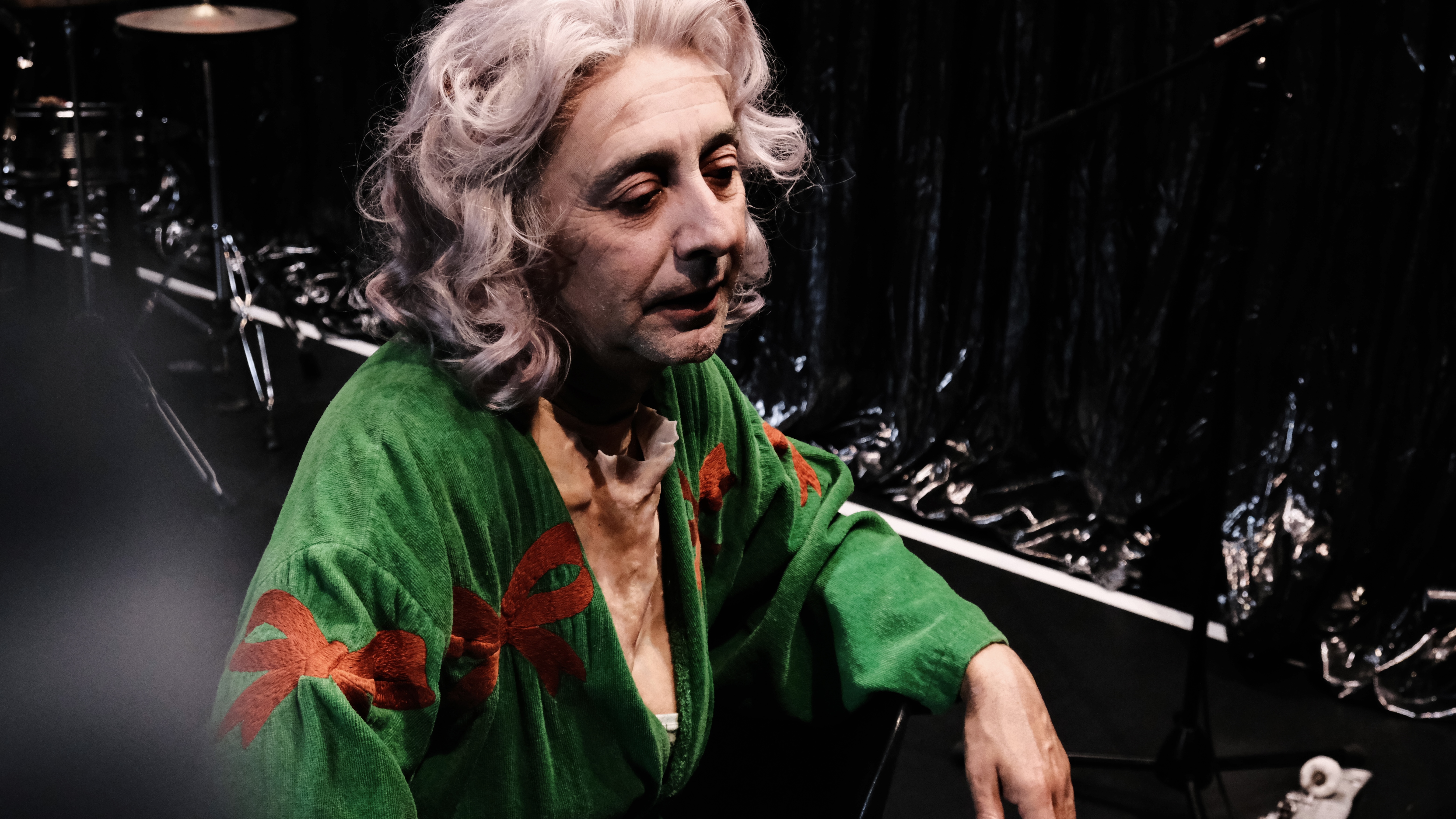Edith Beale au Reno Sweeney/L’art de la chute comme j’aime à le nommer se situera donc dans ce club-fantôme qui en son temps a accueilli de nombreux artistes de la « marge » (sociale ou genrée, voire les deux concernant Holly). Le point de vue de la pièce étant surtout mené par « Little Edie », c’est dans le cadre d’un Reno Sweeney réinventé qu’elle se jouera, Edie conviant sur scène l’équipe du cabaret (et donc du spectacle) pour jouer les autres personnages. Sa mère, bien sûr. Mais aussi le pianiste et les techniciens pour interpréter les différents rôles imaginés par Sara Stridsberg dans le corps d’un seul et même acteur.