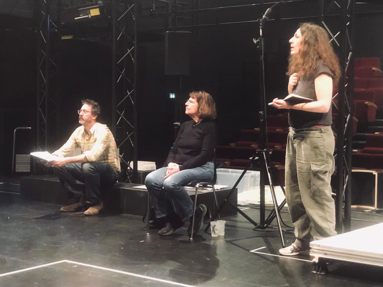 Des présentations publiques ont rendu compte du travail mené dans le cadre des semaines de recherche. Ces présentations comprenaient les esquisses scéniques des étudiant.e.s ainsi que l’évolution/développement de la pièce en cours d’écriture "Voyages avec K."